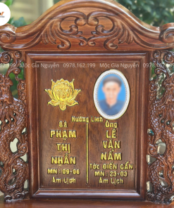 Bài vị đôi gắn ảnh là giải pháp giúp gia đình tiết kiệm không gian, không cần sử dụng thêm khung ảnh rời. Với một bên là di ảnh, bên còn lại là họa tiết hoa sen, mẫu bài vị này vừa tiện dụng vừa cân đối.