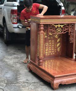 - Một chiếc ban thờ sẽ trải qua rất nhiều công đoạn: Chọn gỗ, cắt xẻ, gắn kết, mài giũa… Cuối cùng là sơn PU, dát vàng.