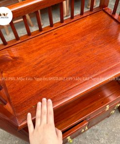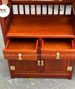 Kệ bày đồ đơn giản được làm bằng chất liệu gỗ hương, được phun sơn Pu nhãn mịn đánh giấy nhám cẩn thận, tỉ mỉ do những người thợ có tay nghề của xưởng Mộc Gia Nguyễn chế tác.