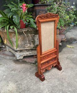 Khung được làm bằng chất liệu gỗ hương ta hoặc hương đá. Nổi bật với hình ảnh trạm hoa sen ở giữa trung tâm khung ảnh.