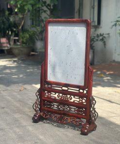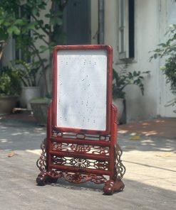 Khung được làm bằng chất liệu gỗ hương ta hoặc hương đá. Nổi bật với hình ảnh trạm hoa sen ở giữa trung tâm khung ảnh.