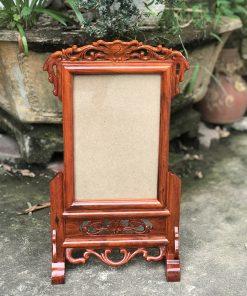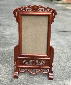 Khung được làm bằng chất liệu gỗ hương ta hoặc hương đá. Nổi bật với hình ảnh trạm hoa sen ở giữa trung tâm khung ảnh.