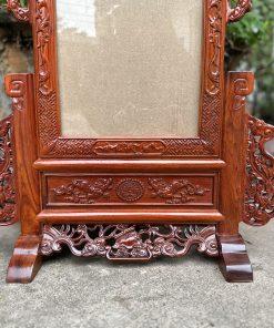 - Trong mẫu khung ảnh này chúng ta sẽ thấy bốn linh thú mạnh nhất trong phong thủy đươc chạm khắc ở đây. Đó chính là Thanh Long, Bạch Hổ, Huyền Vũ, Chu Tước – Long, Ly, Quy, Phụng. Bốn linh thần được chạm trổ và dát vàng cẩn thận, tỉ mỉ.