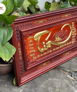 Tranh chữ Tín gỗ hương dát vàng kích thước 67x127cm là một tác phẩm nghệ thuật độc đáo và tinh tế, mang đậm nét truyền thống và sự sang trọng.