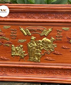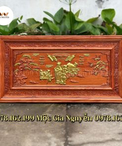 Tranh mừng thọ bà gỗ hương đá dát vàng 67x127cm được thiết kế sang trọng, các đường nét, hình ảnh tinh sảo. Toàn bộ bức tranh được chạm nổi với hình ảnh một cụ ông phúc hậu vui vẻ bên đàn cháu. Bên cạnh là cây tùng, cây mai cổ thụ. Và đôi câu thơ đầy ý nghĩa: “Phúc như đông hải, Thọ tỉ nam sơn”.