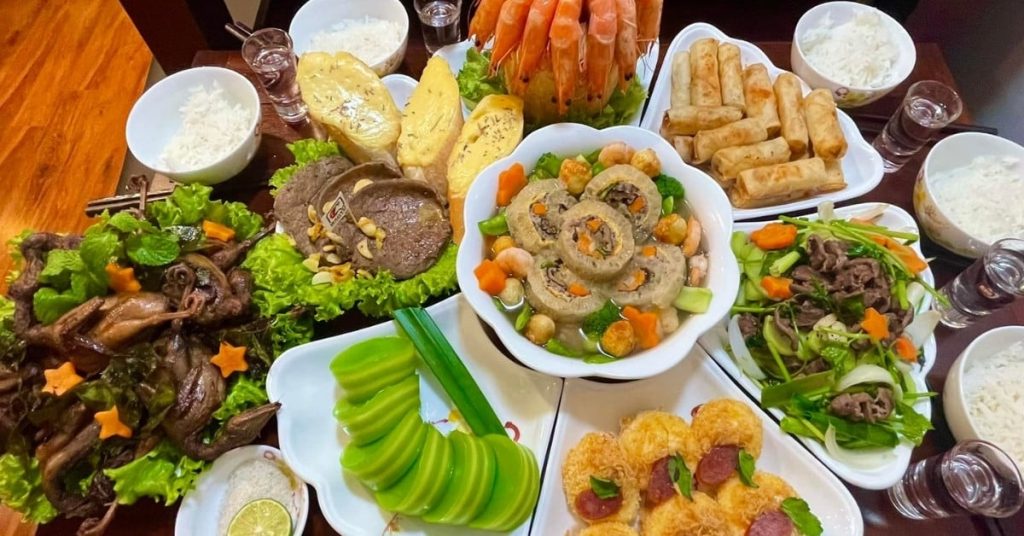 Mâm cơm cúng: Các món ăn cơ bản bao gồm xôi, gà luộc, thịt heo, bánh chưng, cá, cùng với các món ăn truyền thống khác, tùy theo vùng miền.